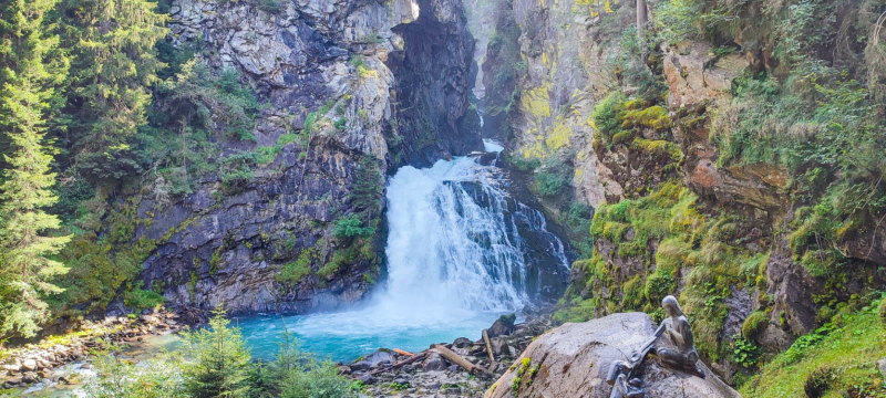 Et pour cause, le débit de la cascade imposant et le vrombrissement de l'eau est impressionnant! On raverse une petit pont en bois qui enjambe le torrent et on se sent tout petit face à cette chute géante!