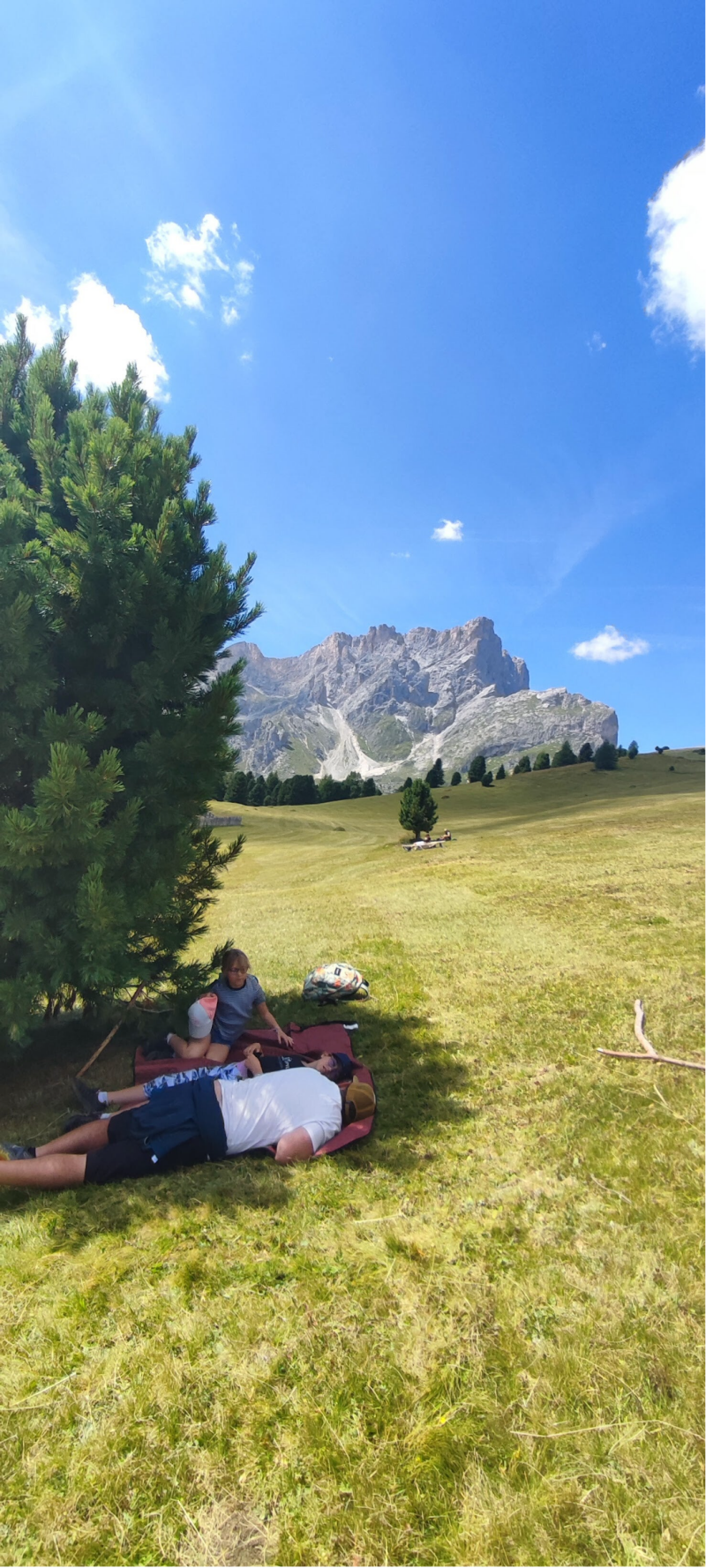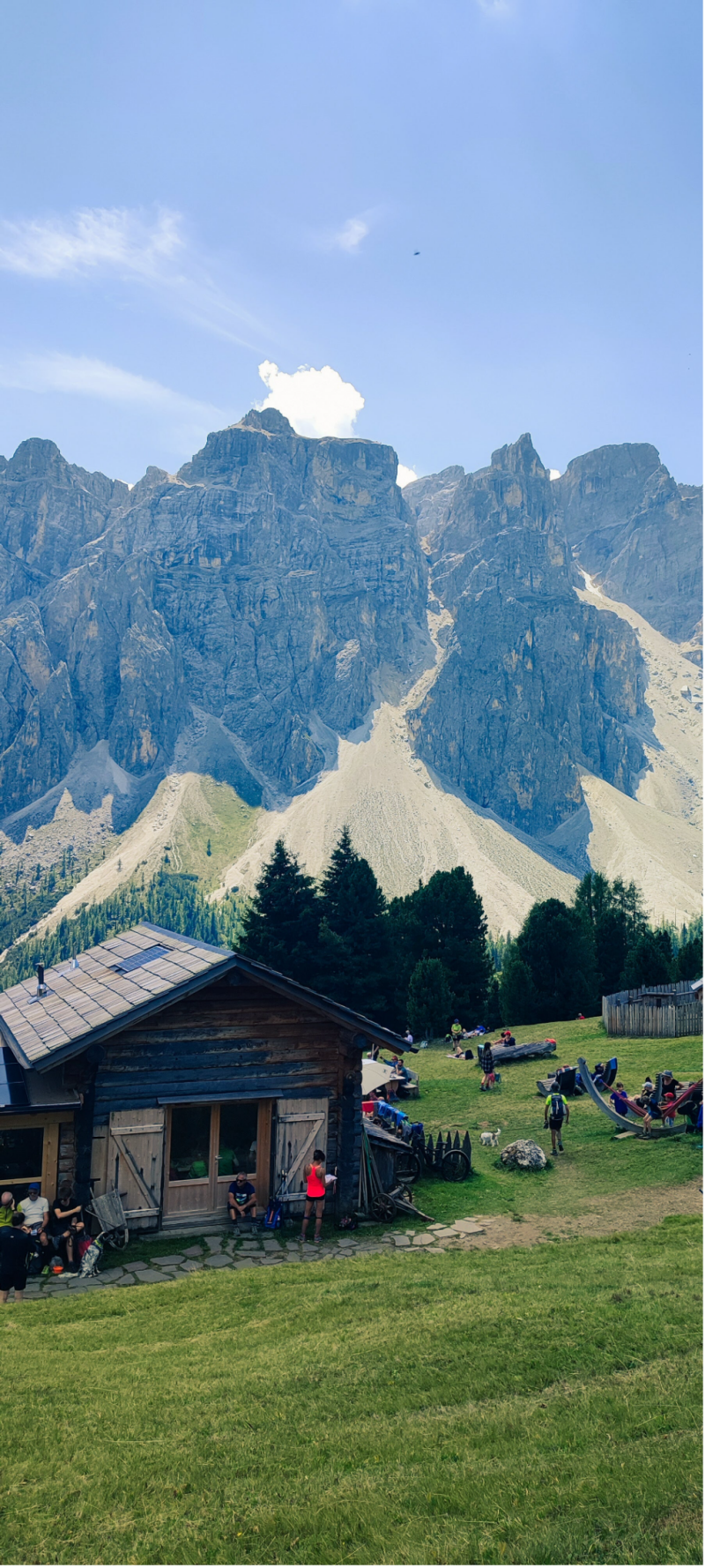 Au point culminant de la randonnée, à 2000m d'altitude, on fait une pause à l'auberge d'Utia Ciampcios où un rafraichissment est le bienvenu après cette grande ascension! Des transats, hamacs et mobilier en bois ornent la prairie face à l'auberge et offre une vue magique fac à ce massif montagneux!