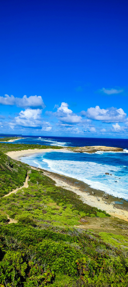 Nous avons ensuite traversé la plage de l'Anse des Châteaux pour rejoindre un sentier, la Trace de Morne Pavillon. Ce chemin mène jusqu'à la croix qui domine la Pointe des Châteaux, offrant un panorama spectaculaire sur l'océan. Pour le retour, nous avons longé les falaises jusqu'à un plateau rocheux puis nous ommes redescendus par un petit chemin bordé d'arbres pour rejoindre le parking.